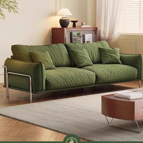 雪尼尔布艺面料+公仔棉靠包+实木内框+高密度海绵+不锈钢装饰+不锈钢脚
