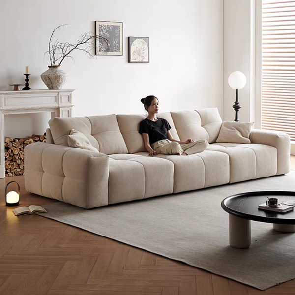 雪尼尔面料+赛羽绒靠包+高密度东亚海绵+实木框架+5公分塑钢脚
