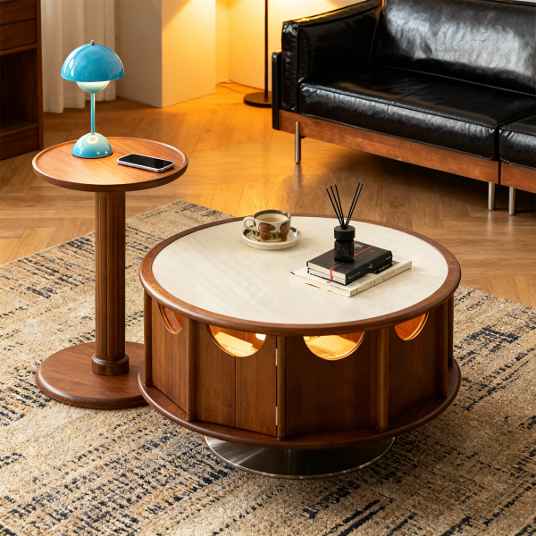 大圆几:多层实木板烤漆+不锈钢架+岩板台面 /小圆几:白蜡木